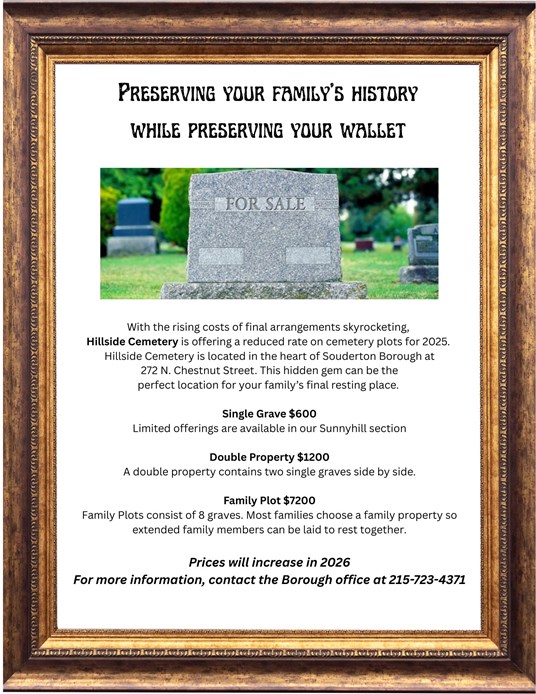 Planning funerals and mortuaries for family members or loved ones. The final arrangement is by preserving a cemetery plot for them. If you are interested in the historical landmark, Hillside cemetery, located at 272 N. Chestnut Street in Souderton. Please contact the borough office, and what we offer below: